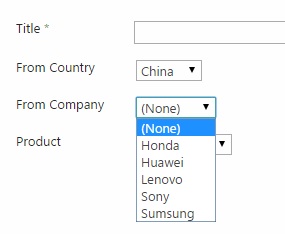 现在实现Country, Company和Product的级联关系,比如当我选择China的时候,From Company的下拉菜单只显示中国的公司。当在From Company的下拉菜单中选择了Lenovo的时候,Product下拉菜单中只显示联想的产品。