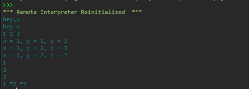 1 #print输出的几种用法 2 3 #用法1:用于输出单个字符串或单个变量 4 print('hey,u') 5 6 #用法2:用于输出多个数据项,用逗号隔开 7 print('hey','u') 8 x,y,z = 1,2,3 9 print(x,y,z) 10 11 #用法3:用户混合字符串和变量值 12 print('x = %d, y = %d, z = %d'%(x, y ,z)) #方式1:传统c风格 13 print('x = {}, y = {}, z = {}'.format(x,y,z)) #方式2:s.format房事 14 print(f'x = {x}, y = {y}, z = {z}') #方式3f-string方式 15 16 #输出后是否变行 17 print(x) #默认输出后换一行 18 print(y) 19 print(z) 20 21 print(x, end=' *') #输出结果后不变行:通过end指定数据项之间的间隔符 22 print(y, end=' *') 23 print(z)