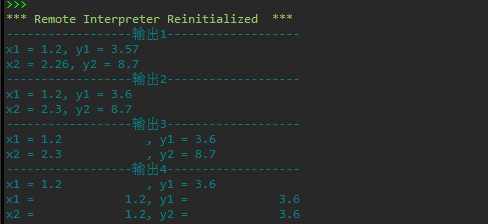 #使用字符串的format()方法,对输出数据项进行格式化 x1,y1 = 1.2, 3.57 x2,y2 = 2.26, 8.7 #输出1 print('{:-^40}'.format('输出1')) #{:-^40}控制输出数据格式:宽度占40列,居中对齐空白处用-补齐 print('x1 = {}, y1 = {}'.format(x1, y1)) print('x2 = {}, y2 = {}'.format(x2, y2)) #输出2 print('{:-^40}'.format('输出2')) print('x1 = {:.1f}, y1 = {:.1f}'.format(x1, y1)) #{:.1f}控制小数输出精度,保留一位 print('x2 = {:.1f}, y2 = {:.1f}'.format(x2, y2)) #输出3 print('{:-^40}'.format('输出3')) print('x1 = {:<15.1f}, y1 = {:<15.1f}'.format(x1, y1)) #控制宽度占15列,小数部分占1列,左对齐,空白处默认补空格 print('x2 = {:<15.1f}, y2 = {:<15.1f}'.format(x2, y2)) #输出4 print('{:-^40}'.format('输出4')) print('x1 = {:<15.1f}, y1 = {:<15.1f}'.format(x1, y1)) #控制宽度占15列,小数部分占1列,右对齐,空白处默认补空格 print('x1 = {:>15.1f}, y1 = {:>15.1f}'.format(x1, y1)) print('x2 = {:>15.1f}, y2 = {:>15.1f}'.format(x1, y1))