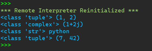 #内置函数eval #功能:把字符串转换为python的表达式 #理解:相当于吧圆括号中的内容两侧引号去掉(用于数字类型的分配) r1 = eval('1,2') #相当于r1 = 1+2 print(type(r1),r1) r2 = eval('1+2j') print(type(r2),r2) r3 = eval('"python"') print(type(r3),r3) r4 = eval('7,42') print(type(r4),r4)