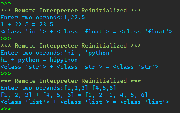 1 #组合使用内置函数eval()和input() 2 3 x, y = eval(input('Enter two oprands:')) 4 ans = x + y 5 6 print(f'{x} + {y} = {ans}') 7 print(f'{type(x)} + {type(y)} = {type(ans)}')