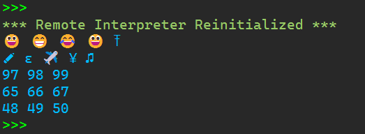 1 #字符编码相关 2 #chr()返回unicode编码对应的字符 3 4 print(chr(0x1f600), end = " ") 5 print(chr(0x1f601), end = " ") 6 print(chr(0x1f602), end = " ") 7 print(chr(0x1f603), end = " ") 8 print(chr(0x10604)) 9 10 print(chr(10000), end = " ") 11 print(chr(0x025b), end = " ") 12 print(chr(0x2708), end = " ") 13 print(chr(0x00A5), end = " ") 14 print(chr(0x266b)) 15 16 #ord返回字符的unicode编码 17 print(ord('a'), end = " ") 18 print(ord('b'), end = " ") 19 print(ord('c')) 20 21 print(ord('A'), end = " ") 22 print(ord('B'), end = " ") 23 print(ord('C')) 24 25 print(ord('0'), end = " ") 26 print(ord('1'), end = " ") 27 print(ord('2'))