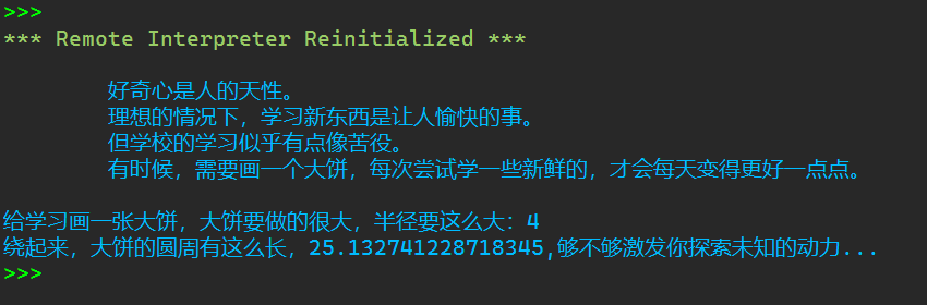 1 #神奇的pi,与大饼 2 3 import math 4 5 text = ''' 6 好奇心是人的天性。 7 理想的情况下,学习新东西是让人愉快的事。 8 但学校的学习似乎有点像苦役。 9 有时候,需要画一个大饼,每次尝试学一些新鲜的,才会每天变得更好一点点。 10 ''' 11 print(text) 12 13 r = float(input('给学习画一张大饼,大饼要做的很大,半径要这么大:')) 14 15 circle = 2*math.pi*r 16 17 print(f'绕起来,大饼的圆周有这么长,{circle},够不够激发你探索未知的动力...')