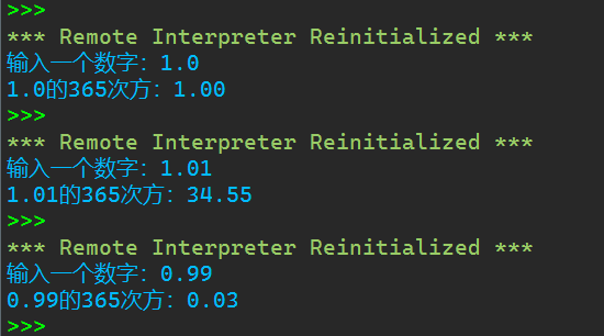 1 #计算一个数365次方 2 3 x = float(input('输入一个数字:')) 4 y = x**356 5 6 print(f'{x}的365次方:{y:.2f}')