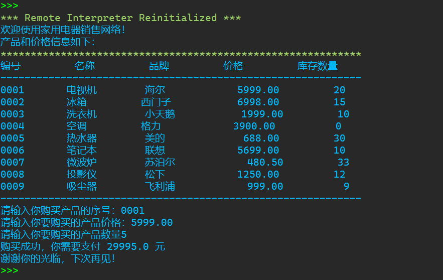 1 """ 2 家用电器销售系统 3 v1.0 4 """ 5 #欢迎信息 6 print('欢迎使用家用电器销售网络!') 7 8 #产品信息列表 9 print('产品和价格信息如下:') 10 print('*'*60) 11 print('%-10s'%'编号', '%-10s'%'名称', '%-10s'%'品牌', '%-10s'%'价格', '%-10s'%'库存数量') 12 print('-'*60) 13 a1,a2,a3,a4,a5 = '0001','电视机','海尔','5999.00','20' 14 b1,b2,b3,b4,b5 = '0002','冰箱','西门子','6998.00','15' 15 c1,c2,c3,c4,c5 = '0003','洗衣机','小天鹅','1999.00','10' 16 d1,d2,d3,d4,d5 = '0004','空调','格力','3900.00','0' 17 e1,e2,e3,e4,e5 = '0005','热水器','美的','688.00','30' 18 f1,f2,f3,f4,f5 = '0006','笔记本','联想','5699.00','10' 19 g1,g2,g3,g4,g5 = '0007','微波炉','苏泊尔','480.00','33' 20 h1,h2,h3,h4,h5 = '0008','投影仪','松下','1250.00','12' 21 i1,i2,i3,i4,i5 = '0009','吸尘器','飞利浦','999.00','9' 22 print(f'{a1:<10}{a2:<10}{a3:<10}{a4:<10}{a5:>10}') 23 print(f'{b1:<10}{b2:<10}{b3:<10}{b4:<10}{b5:>10}') 24 print(f'{c1:<10}{c2:<10}{c3:<10}{c4:<10}{c5:>10}') 25 print(f'{d1:<10}{d2:<10}{d3:<10}{d4:<10}{d5:>10}') 26 print(f'{e1:<10}{e2:<10}{e3:<10}{e4:<10}{e5:>10}') 27 print(f'{f1:<10}{f2:<10}{f3:<10}{f4:<10}{f5:>10}') 28 print(f'{g1:<10}{g2:<10}{g3:<10}{g4:<10}{g5:>10}') 29 print(f'{h1:<10}{h2:<10}{h3:<10}{h4:<10}{h5:>10}') 30 print(f'{i1:<10}{i2:<10}{i3:<10}{i4:<10}{i5:>10}') 31 print('-'*60) 32 33 #用户输入信息 34 product_id = input('请输入你购买产品的序号:') 35 price = float(input('请输入你要购买的产品价格:')) 36 count = int(input('请输入你要购买的产品数量')) 37 38 #计算金额 39 print('购买成功,你需要支付',price*count,'元') 40 41 #退出系统 42 print('谢谢你的光临,下次再见!')
