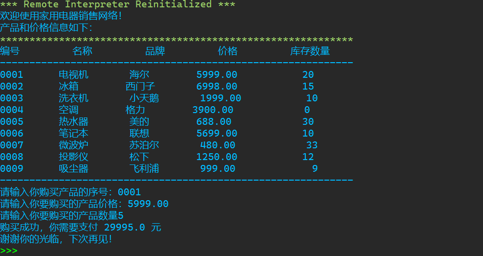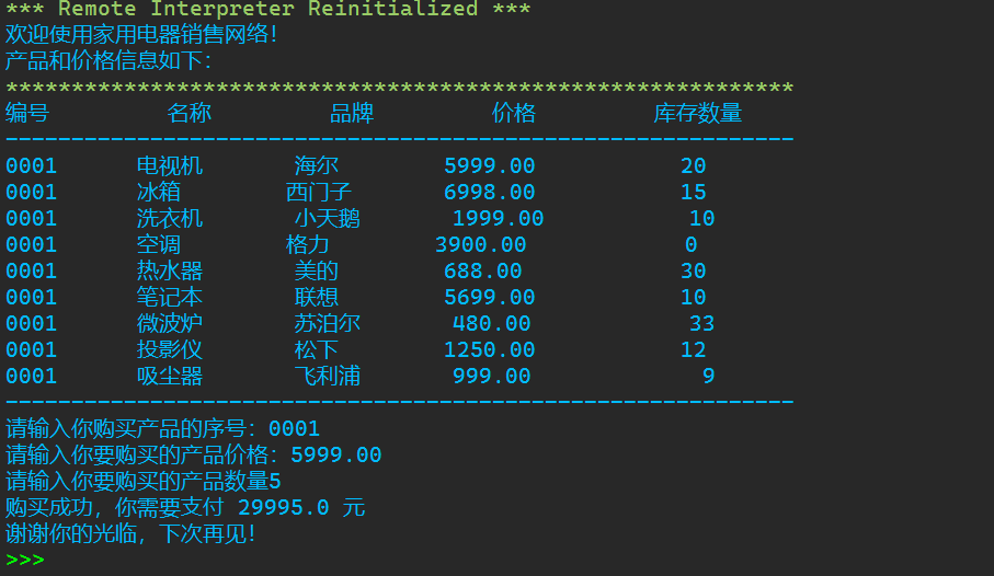 1 """ 2 家用电器销售系统 3 v1.0 4 """ 5 #欢迎信息 6 print('欢迎使用家用电器销售网络!') 7 8 #产品信息列表 9 print('产品和价格信息如下:') 10 print('*'*60) 11 print('%-10s'%'编号', '%-10s'%'名称', '%-10s'%'品牌', '%-10s'%'价格', '%-10s'%'库存数量') 12 print('-'*60) 13 print('%-10s'%'0001', '%-10s'%'电视机', '%-10s'%'海尔', '%10.2f'%5999.00, '%10d'%20) 14 print('%-10s'%'0002', '%-10s'%'冰箱', '%-10s'%'西门子', '%10.2f'%6998.00, '%10d'%15) 15 print('%-10s'%'0003', '%-10s'%'洗衣机', '%-10s'%'小天鹅', '%10.2f'%1999.00, '%10d'%10) 16 print('%-10s'%'0004', '%-10s'%'空调', '%-10s'%'格力', '%10.2f'%3900.00, '%10d'%0) 17 print('%-10s'%'0005', '%-10s'%'热水器', '%-10s'%'美的', '%10.2f'%688.00, '%10d'%30) 18 print('%-10s'%'0006', '%-10s'%'笔记本', '%-10s'%'联想', '%10.2f'%5699.00, '%10d'%10) 19 print('%-10s'%'0007', '%-10s'%'微波炉', '%-10s'%'苏泊尔', '%10.2f'%480.50, '%10d'%33) 20 print('%-10s'%'0008', '%-10s'%'投影仪', '%-10s'%'松下', '%10.2f'%1250.00, '%10d'%12) 21 print('%-10s'%'0009', '%-10s'%'吸尘器', '%-10s'%'飞利浦', '%10.2f'%999.00, '%10d'%9) 22 print('-'*60) 23 24 #用户输入信息 25 product_id = input('请输入你购买产品的序号:') 26 price = float(input('请输入你要购买的产品价格:')) 27 count = int(input('请输入你要购买的产品数量')) 28 29 #计算金额 30 print('购买成功,你需要支付',price*count,'元') 31 32 #退出系统 33 print('谢谢你的光临,下次再见!')