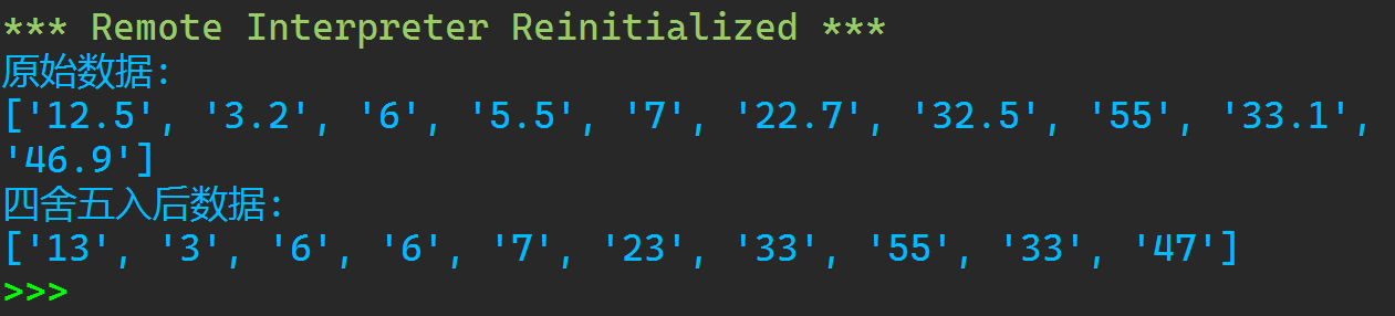 1 import csv 2 title = [] 3 info = [] 4 5 with open('data6.csv','r',encoding='gbk') as f: 6 f_reader = csv.reader(f) 7 for line in f_reader: 8 info.append(line) 9 x = info.pop(0) 10 title.append(x) 11 title[0].append('四舍五入后数据') 12 for i in info: 13 mypoia = int(float(i[0])+0.5) 14 i.append(str(mypoia)) 15 16 with open('data6_processed.csv','w',encoding='gbk',newline = '') as f: 17 f_writer = csv.writer(f) 18 f_writer.writerow(title[0]) 19 f_writer.writerows(info) 20 21 print(title[0][0] + ':') 22 o = [] 23 for i in info: 24 o.append(i[0]) 25 print(o) 26 print(title[0][1] + ':') 27 p = [] 28 for i in info: 29 p.append(i[1]) 30 print(p)import csv 31 title = [] 32 info = [] 33 34 with open('data6.csv','r',encoding='gbk') as f: 35 f_reader = csv.reader(f) 36 for line in f_reader: 37 info.append(line) 38 x = info.pop(0) 39 title.append(x) 40 title[0].append('四舍五入后数据') 41 for i in info: 42 mypoia = int(float(i[0])+0.5) 43 i.append(str(mypoia)) 44 45 with open('data6_processed.csv','w',encoding='gbk',newline = '') as f: 46 f_writer = csv.writer(f) 47 f_writer.writerow(title[0]) 48 f_writer.writerows(info) 49 50 print(title[0][0] + ':') 51 o = [] 52 for i in info: 53 o.append(i[0]) 54 print(o) 55 print(title[0][1] + ':') 56 p = [] 57 for i in info: 58 p.append(i[1]) 59 print(p)