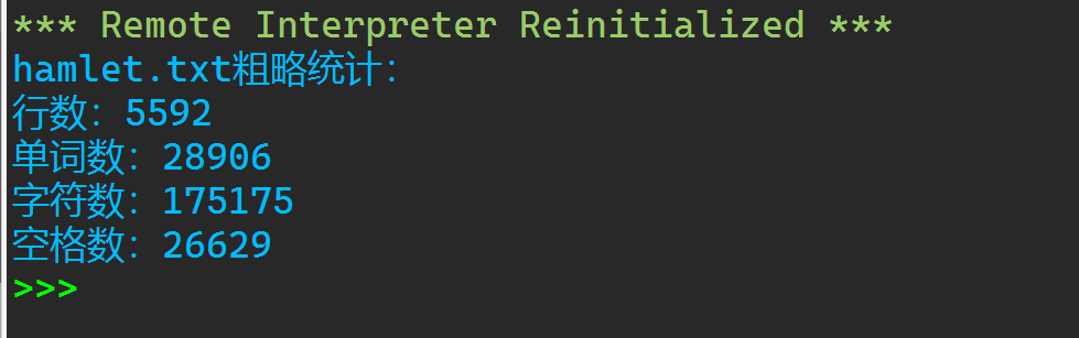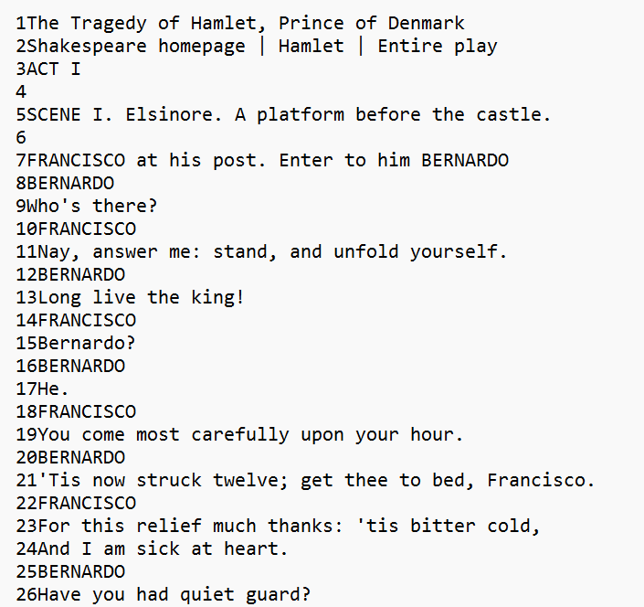 1 with open('hamlet.txt','r',encoding= 'utf-8') as f: 2 text = f.readlines() 3 lin = 0 4 for line in text: 5 lin += 1 6 words = [] 7 for i in text: 8 if not i.isspace(): 9 words.append(i) 10 words_c = 0 11 import re 12 for i in words: 13 i = re.split(' |\n|\t|:|,|;',i) 14 for word in i: 15 if word.isalpha(): 16 words_c += 1 17 characters = 0 18 for i in text: 19 for character in i: 20 characters += 1 21 blanks = 0 22 for i in text: 23 for blank in i: 24 if blank == ' ': 25 blanks += 1 26 print('hamlet.txt粗略统计:') 27 print(f'行数:{lin}') 28 print(f'单词数:{words_c}') 29 print(f'字符数:{characters}') 30 print(f'空格数:{blanks}') 31 32 33 lines = [] 34 for number, line in enumerate(text, 1): 35 lines.append(f'{number}{line}') 36 with open('hamlet_with_line_number.txt','w',encoding='utf-8') as f: 37 for line in lines: 38 f.write(line)