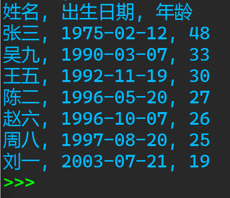 import datetime def is_valid(x): if len(x) == 18 and x[:-1].isdigit() and (x[-1].isdigit() or x[-1] == 'X'): return True else: return False with open('data9_id.txt', 'r', encoding='utf-8') as f: data0 = f.readlines() title = data0.pop(0) data0 = [i.strip('\n').split(',') for i in data0] data1 = [] for i in data0: if is_valid(i[1]): data1.append(i) print(data1) t = datetime.datetime.now() y = t.strftime('%Y%m%d') for i in data1: age = str(int(y)-int(i[1][6:14])) i.append(age[:2]) i[1] = i[1][6:10] + '-' + i[1][10:12] + '-' + i[1][12:14] data2 = sorted(data1, key=lambda x: -int(x[2])) print('姓名, 出生日期, 年龄') for i in data2: print(', '.join(i))