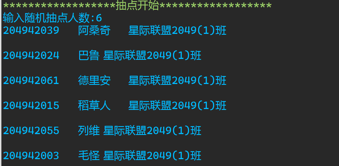 1 with open('data10_stu.txt','r',encoding='utf-8') as f: 2 data = f.readlines() 3 print('{:*^40}'.format('抽点开始')) 4 n = int(input('输入随机抽点人数:')) 5 import random 6 sum1 = 0 7 x = [] 8 x2 = '' 9 counts = 0 10 while counts < n: 11 new = random.randint(0, len(data) - 1) 12 if new in x: 13 new = random.randint(0, len(data) - 1) 14 else: 15 counts +=1 16 x.append(new) 17 for i in range(n): 18 print(data[x[i]]) 19 x2 += data[x[i]] 20 sum1 += n 21 with open('20230602.txt','w',encoding='utf-8') as f: 22 f.writelines(x2)