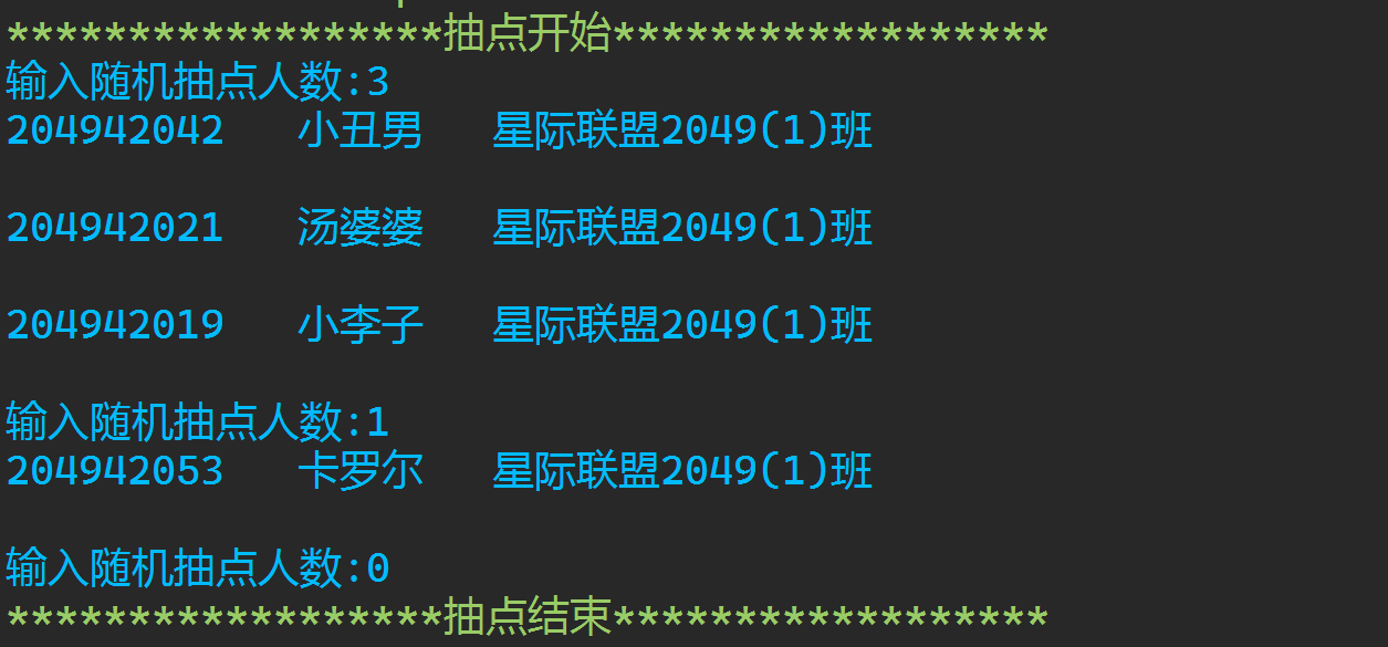 1 with open('data10_stu.txt','r',encoding='utf-8') as f: 2 data = f.readlines() 3 print('{:*^40}'.format('抽点开始')) 4 lst1 = [] 5 x = [] 6 while True: 7 n = int(input('输入随机抽点人数:')) 8 if n == 0: 9 print('{:*^40}'.format('抽点结束')) 10 break 11 else: 12 x = [] 13 import random 14 while len(x) < n: 15 t = random.randint(0, len(data)-1) 16 if (str(t) not in lst1) and (str(t) not in x): 17 x.append(t) 18 lst1.append(t) 19 20 lst = [] 21 for i in x: 22 print(data[i],end = '\n') 23 lst.append(data[i]) 24 25 import datetime 26 t = datetime.datetime.now() 27 y = t.strftime('%Y%m%d') 28 with open(f'{y}.txt','w',encoding='utf-8') as f: 29 f.writelines(lst)