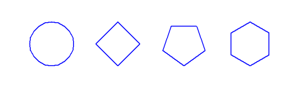 1 from turtle import * 2 3 def moveto(x, y): 4 penup() 5 goto(x, y) 6 pendown() 7 8 def main(): 9 pensize(2) 10 pencolor('blue') 11 12 moveto(-150, 0) 13 circle(50) 14 15 moveto(0, 0) 16 circle(50, steps = 4) 17 18 moveto(150, 0) 19 circle(50, steps = 5) 20 21 moveto(300, 0) 22 circle(50, steps = 6) 23 24 hideturtle() 25 done() 26 27 main()