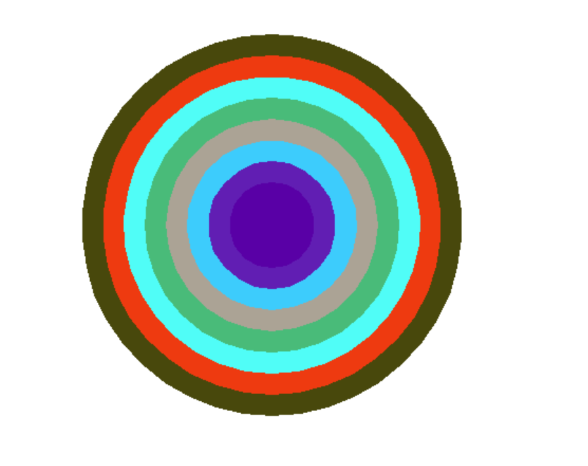 1 from turtle import * 2 from random import random 3 4 speed(0) 5 6 def moveto(x, y): 7 penup() 8 goto(x, y) 9 pendown() 10 11 def gen_color(): 12 return tuple(random() for i in range(3)) 13 14 def main(): 15 setup(800, 600) #设置画板尺寸大小 16 17 radius = 180 #圆初始半径 18 offset = 20 #同心圆每次位移量 19 20 for i in range(8): 21 moveto(0, -radius) 22 color(gen_color()) 23 24 begin_fill() 25 circle(radius) 26 end_fill() 27 hideturtle() 28 29 radius -= offset 30 31 hideturtle() 32 done() 33 main()