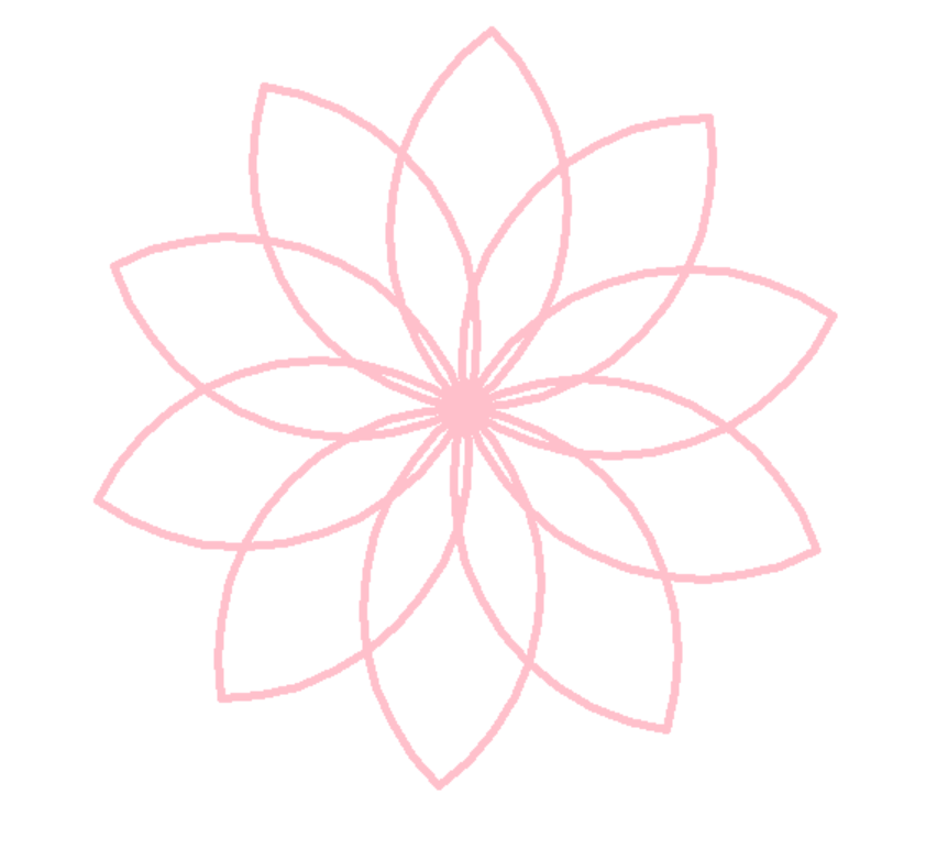 1 from turtle import * 2 3 setup(800, 600) 4 pencolor('pink') 5 pensize(5) 6 speed(0) 7 8 n = 10 9 for i in range(n): 10 for j in range(2): 11 circle(150, 100) 12 left(80) 13 14 right(360/n) 15 16 hideturtle() 17 done()