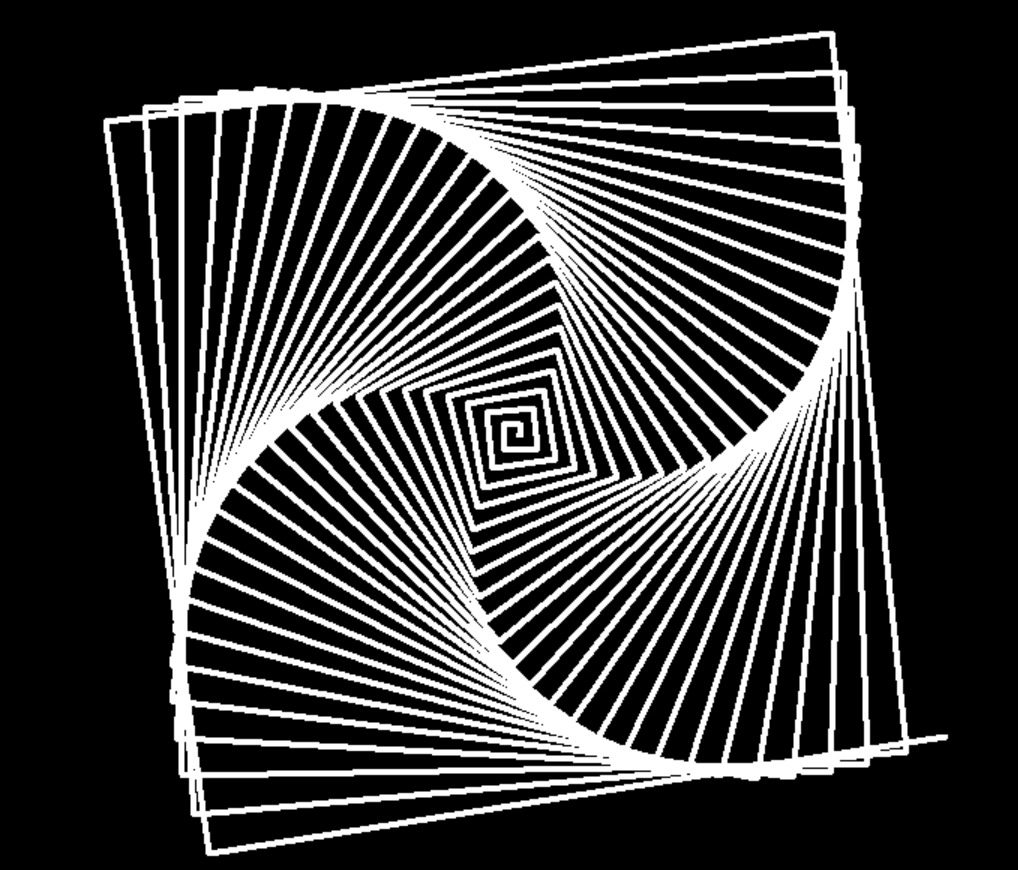 1 from turtle import * 2 3 setup(800, 600) 4 bgcolor('black') 5 pencolor('white') 6 speed(0) 7 pensize(4) 8 9 angle = 0 10 size = 2 11 12 n = 4 13 count = 100 14 for i in range(count): 15 fd(size) 16 angle += 360/n + 1 17 seth(angle) 18 size += 5 19 20 hideturtle() 21 done()