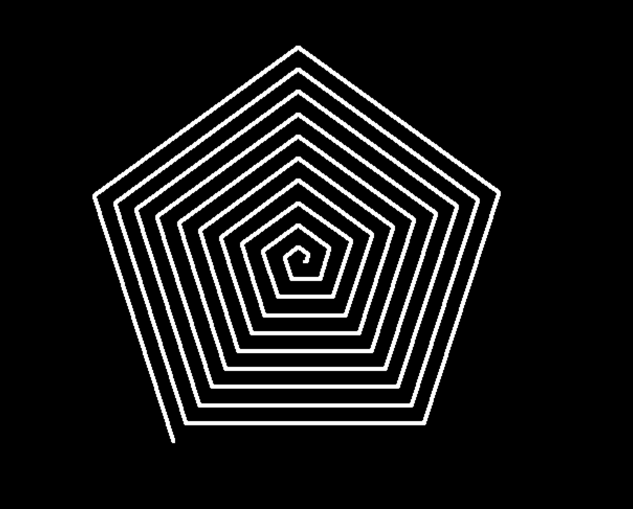1 from turtle import * 2 3 setup(800, 600) 4 bgcolor('black') 5 pencolor('white') 6 speed(0) 7 pensize(4) 8 9 angle = 0 10 size = 2 11 12 n = 5 13 count = 50 14 for i in range(count): 15 fd(size) 16 angle += 360/n 17 seth(angle) 18 size += 5 19 20 hideturtle() 21 done()