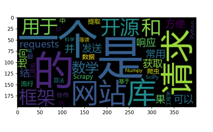 1 import jieba 2 from wordcloud import WordCloud 3 from matplotlib import pyplot as plt 4 5 text = '''requests是一个常用的HTTP请求库,可以方便地向网站发送HTTP请求,并获取响应结 6 果。 7 Scrapy是一个开源和协作框架,用于从网站中提取数据,是最流行的爬虫框架。 8 SciPy是一个开源的Python算法库和数学工具包,它基于Numpy,用于数学、科学、工程学等领 9 域。''' 10 11 word = jieba.lcut(text) #使用jieba模块的函数lcut()对中文文本进行精确分词 12 13 t = ' '.join(word) 14 t_wc = WordCloud(font_path = 'msyh.ttc').generate(t) #创建wordcloud对象,使用其他方法generate()生成词云 15 t_wc.to_file('wordcloud.png') #保存词云图片 16 17 plt.imshow(t_wc) 18 plt.axis() 19 plt.show()