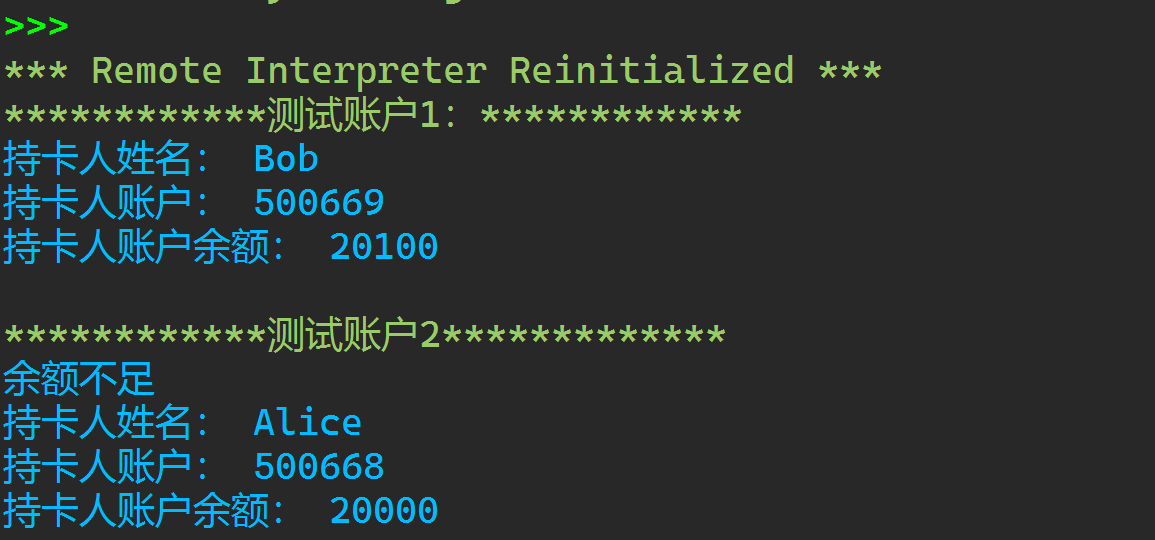 1 class Account: 2 3 def __init__(self, name, account_number, initial_amount = 10): 4 self._name = name 5 self._card_no = account_number 6 self._blance = initial_amount 7 8 def deposit(self, amount): 9 self._blance += amount 10 11 def withdraw(self, amount): 12 if self._blance < amount: 13 print('余额不足') 14 return 15 16 self._blance -= amount 17 18 def info(self): 19 print('持卡人姓名:', self._name) 20 print('持卡人账户:', self._card_no) 21 print('持卡人账户余额:', self._blance) 22 23 def get_blance(self): 24 return self._blance 25 26 def main(): 27 print('测试账户1:'.center(30, '*')) 28 a1 = Account('Bob', '500669', 20000) 29 a1.deposit(500) 30 a1.withdraw(400) 31 a1.info() 32 33 print() 34 35 print('测试账户2'.center(30, '*')) 36 a2 = Account('Alice', '500668', 30000) 37 a2.withdraw(10000) 38 a2.withdraw(30000) 39 a2.info() 40 41 if __name__ == '__main__': #后面的内容只有在自己使用的时候才会被引用,如果其他的程序不会运行 42 main()
