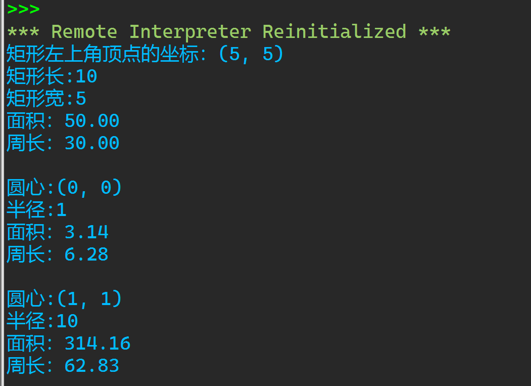 1 from shape_mood import Rect, Circle 2 3 shape_lst = [Rect(5, 5, 10, 5), Circle(), Circle(1, 1, 10)] 4 5 for i in shape_lst: 6 i.info() 7 print(f'面积:{i.area():.2f}') 8 print(f'周长:{i.perimeter():.2f}') 9 print()