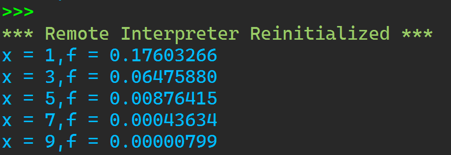1 def func(x, m = 0, s = 2): 2 import math 3 x1 = 1/(math.sqrt(2 * math.pi) * s) 4 x2 = (-1/2) * ((x-m)/s)**2 5 x3 = math.exp(x2) 6 7 return x1 * x3 8 9 def main(): 10 fun_lst = [1, 3, 5, 7, 9] 11 for i in fun_lst: 12 print(f'x = {i}', end = ',') 13 print(f'f = {func(i):.8f}') 14 15 if __name__ == '__main__': 16 main()