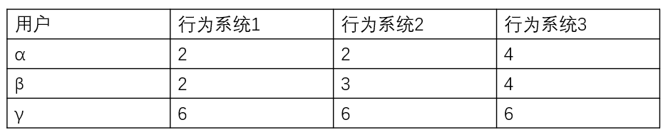 其实最早这个算法是用在推荐商品上的,一开始就叫“买过A商品的人也喜欢B”这样的一个推荐。然后我们将用户的一些行为与数据进行建模打分,放到一个多维向量坐标里(这里假设一个三维坐标系好了)。我们假设有三个用户α、β、γ,然后他们分别有三个行为系统,服务器搜集了他们的一些行为之后,对他们的偏好打分,并且分别放到三个行为系统的向量里。