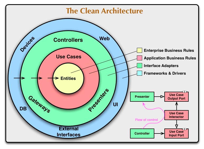 随着架构的演化,后来又提出了洋葱架构和整洁架构,这些架构大同小异,它们都只允许外层依赖内层,不允许内层知道外层的细节,下图是整洁架构图,详细介绍这里就不作赘述,可以参考这篇文章:The Clean Architecture。