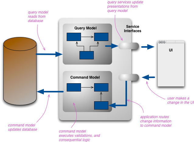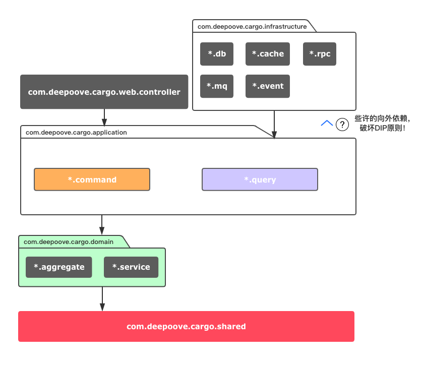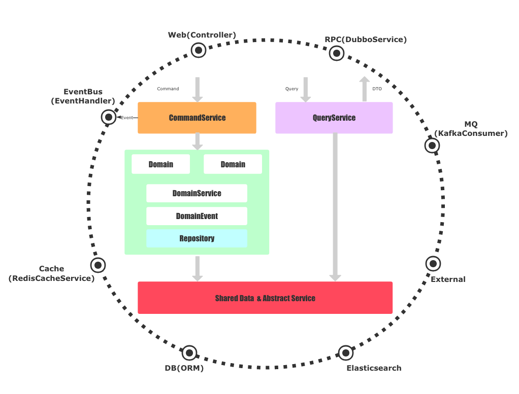 当一个命令Command请求过来时,会通过应用层的CommandService去协调领域层工作,而一个查询Query请求过来时,则直接通过基础实施的实现与数据库或者外部服务交互。再次强调,我们所有的抽象都定义在圆圈内部,实现都在基础设施。