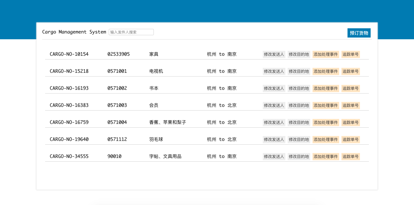 落地代码实现了一个简单的货运系统,主要功能包括预订货物、修改货运信息、添加货运事件和追踪货运物流信息等,具体源码参见:GitHub:https://github.com/Sayi/ddd-cargo