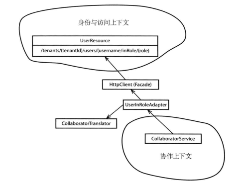图中Adapter就是适配器,通用做法会再创建一个Translator实现上下文模型之间的翻译功能。