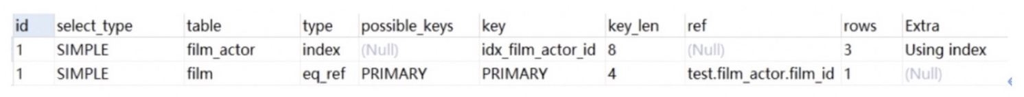 2.关联表查询,idx_film_actor_id是film_id和actor_id的联合索引,这里使用到了film_actor的左边前缀film_id部分。