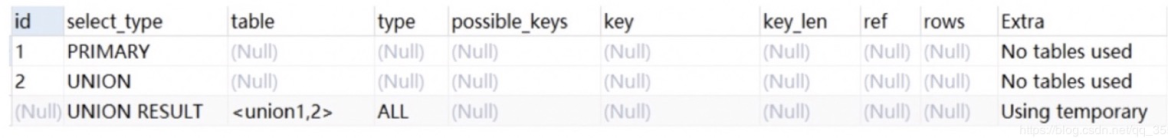 6)union result:从 union 临时表检索结果的 select 用这个例子来了解 union 和 union result 类型: