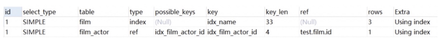 - film.name建立了idx_name索引,此时查询时extra是using index