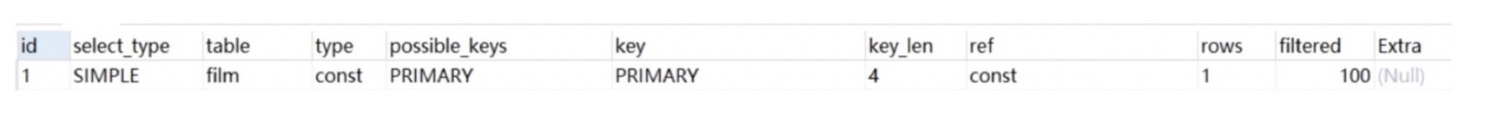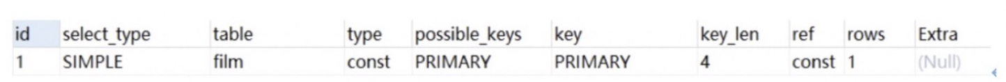 这一列显示了在key列记录的索引中,表查找值所用到的列或常量,常见的有:const(常量),字段名(例:film.id)