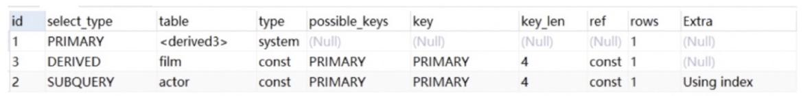 4)derived:包含在 from 子句中的子查询。MySQL会将结果存放在一个临时表中,也称为派生表(derived的英文含义) 用这个例子来了解 primary、subquery 和 derived 类型