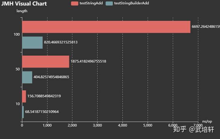 该部分显示测量迭代的情况,每一次迭代都显示了当前的执行速率,即一个操作所花费的时间。在进行 5 次迭代后,进行统计,在本例中,length 为 100 的情况下 testStringBuilderAdd
