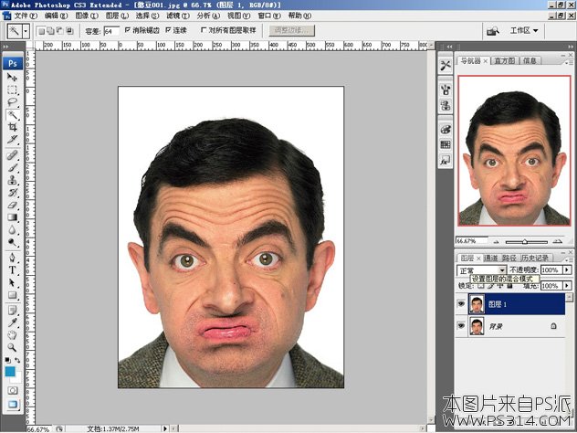 在 Photoshop 的工具栏里找到魔棒工具,然后在 Photoshop 的工具选项栏中将容差调整的大一点,这里我调整到了 64。在背景的白色上面点一下,将白色部分选出。注:这里将容差调大,是为了避免在人物的周围存有白色,这样的白边是很难处理的,会让照片看起来很不自然。