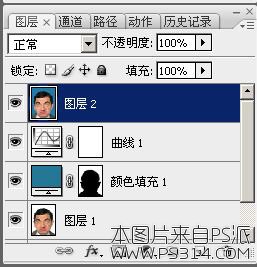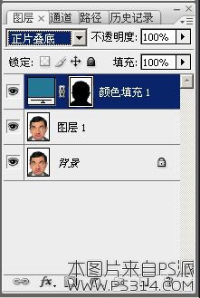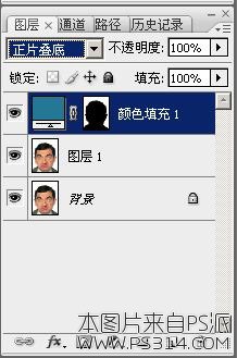 颜色填充 1 图层为蓝色,蒙版为纯白色的地方会呈蓝色;
