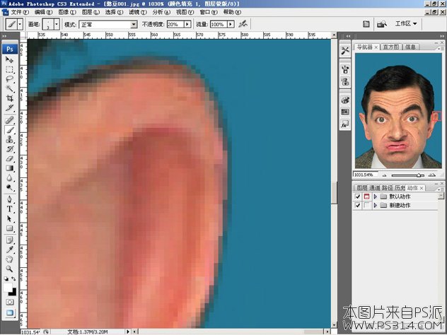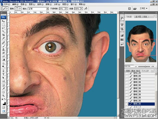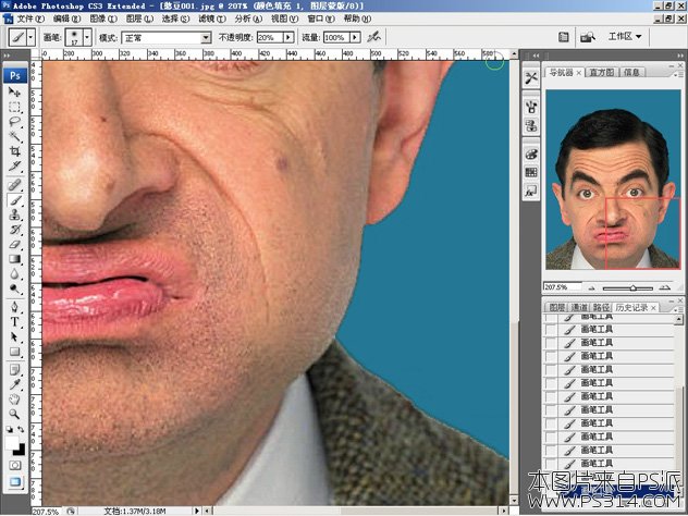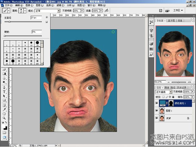 这是一个细活,首先选择一个合适的画笔,这个需要根据图片的具体情况而定,我选择了半径为27xp,硬度为0%的圆头画笔。