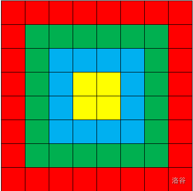 但是这题数据大小是 \(n \le 3000\),我们是没办法暴力修改每一个块的。我们再研究一下上面的图。可以发现,其实每个“圈”的旋转角度是固定的,例如,红圈每次只转 90 度,绿圈只转 180 度,篮圈只转 270 度,黄圈只转 360 度(相当于没转),再往下呢,又是一个新的循环。所以,每一圈赚多少我们是明确的。第一大外圈要转 90 度,第二大外圈要转 180 度,第三大外圈要转 270 度,第四大外圈不转...,以此类推。做法就出来了。