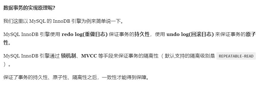 REPEATABLE-READ)。 - 保证了事务的持久性、原子性、隔离性之后,一致性才能得到保障。