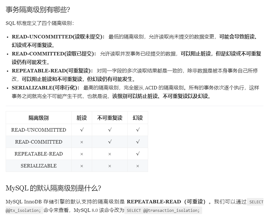 - MySQL InnoDB 引擎通过 锁机制、MVCC 等手段来保证事务的隔离性( 默认支持的隔离级别是
