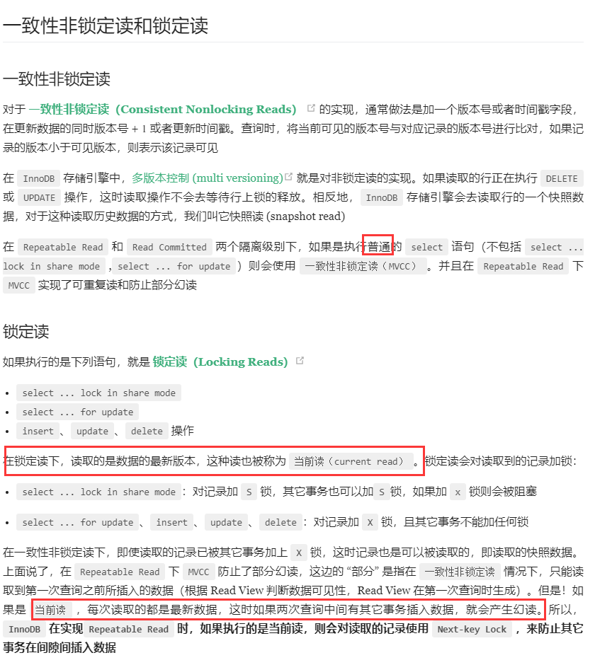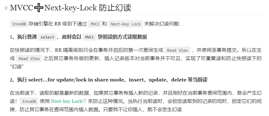 首先了解一致性非锁定读和锁定读。InnoDB引擎普通索引都会使用MVCC。可以解决幻读。
