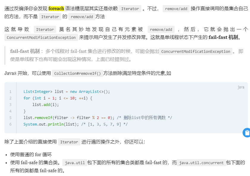 3、不要在 foreach 循环里进行元素的 remove/add 操作。remove 元素请使用 Iterator 方式,如果并发操作,需要对 Iterator 对象加锁。