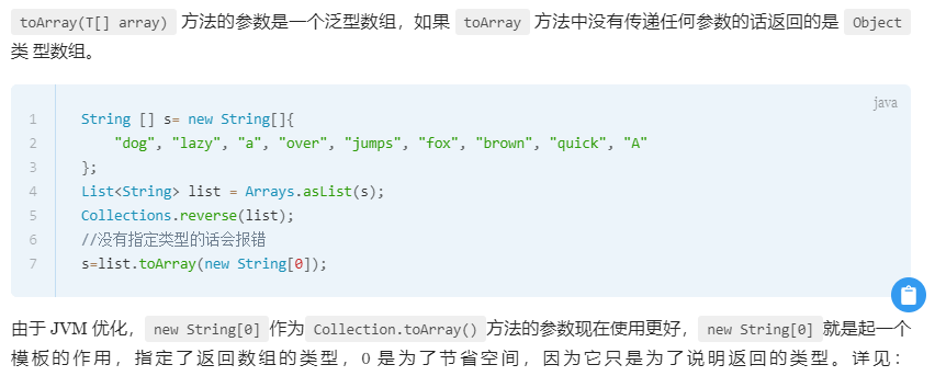 5、使用集合转数组的方法,必须使用集合的 toArray(T[] array),传入的是类型完全一致、长度为 0 的空数组。