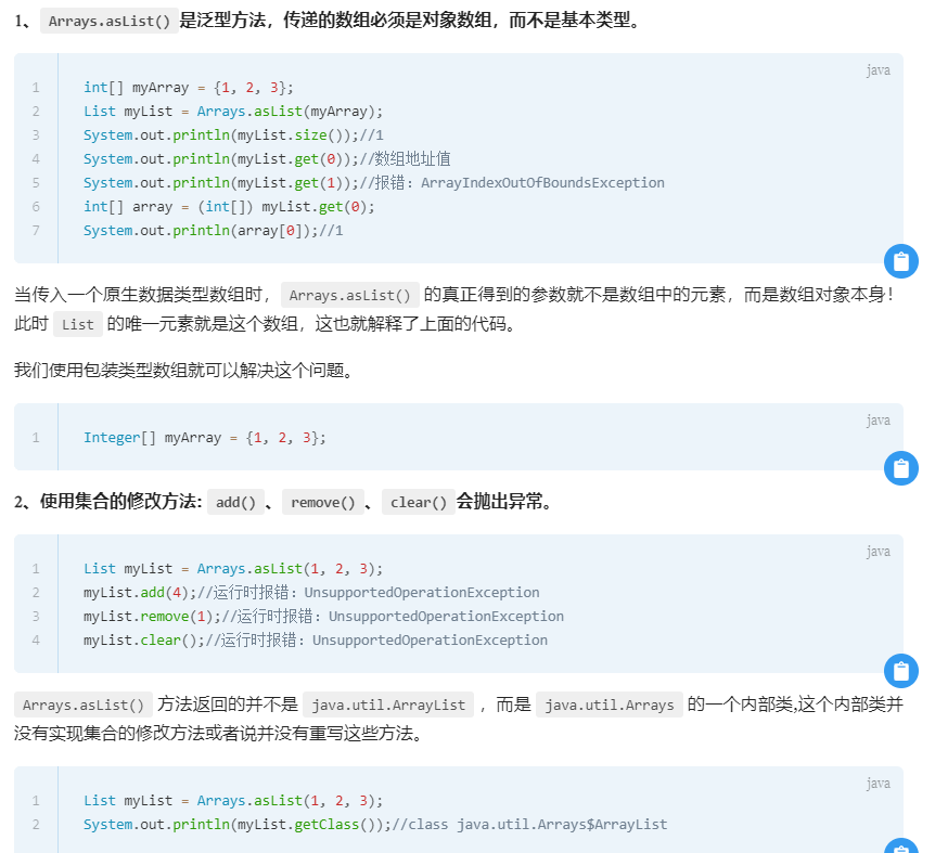 6、使用工具类 Arrays.asList() 把数组转换成集合时,不能使用其修改集合相关的方法, 它的 add/remove/clear 方法会抛出 UnsupportedOperationException 异常。传基本类型会传递数组地址。因为java值传递,而asList参数是泛型对象。