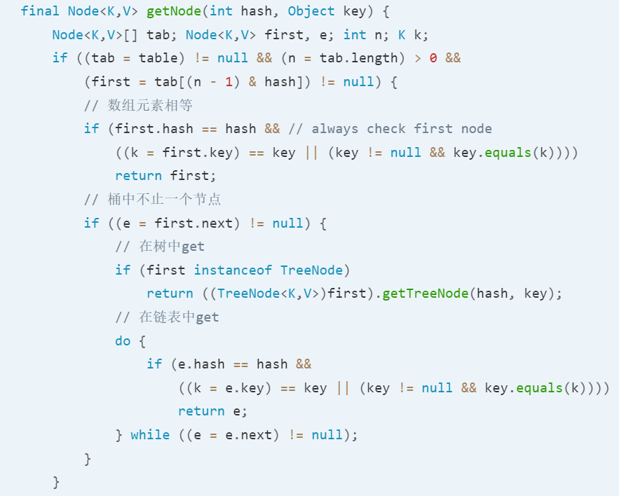 get()方法先找到在数组中的位置(产生的hash对数组取模,这也是为啥hashmap大小是2的幂的原因),然后比较第一个的hash和key的hash是否相等,相等则比较值是否相等,用first.key==key是因为hashmap的key可以为null,如果是null,那么equals会抛出异常。