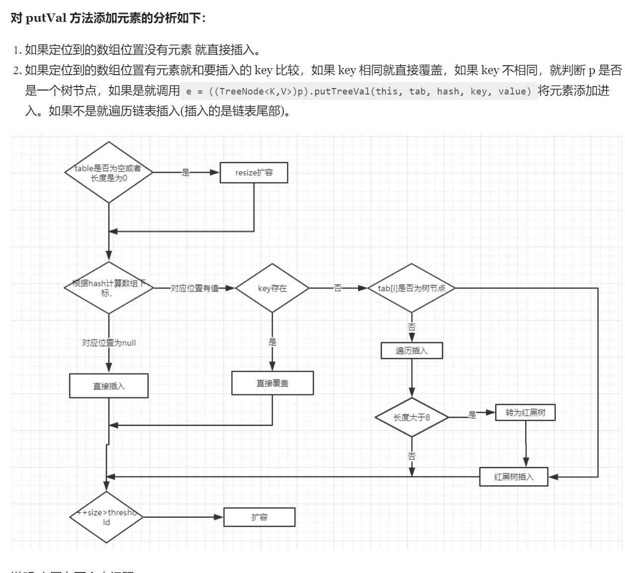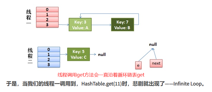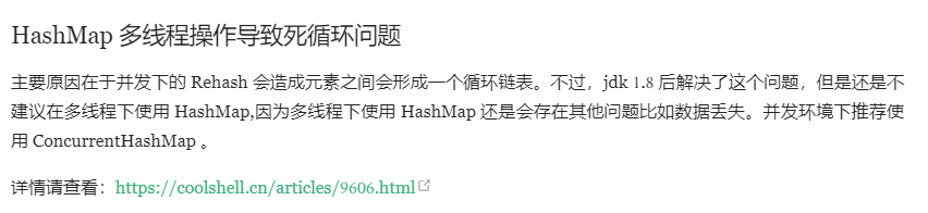 hashMap在java1.7及之前因为采用头插法在rehash过程中会出现死循环问题,1.8采用头插法解决了这个问题。