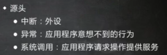 系统调用即应用程序主动发起的请求操作系统提供服务的请求。异常是应用程序发生的异常情况,由操作系统捕获并处理(可能直接杀掉应用程序,或者可能通过操作系统处理后重新运行应用程序)。中断IO是外设介入操作系统的手段。