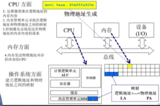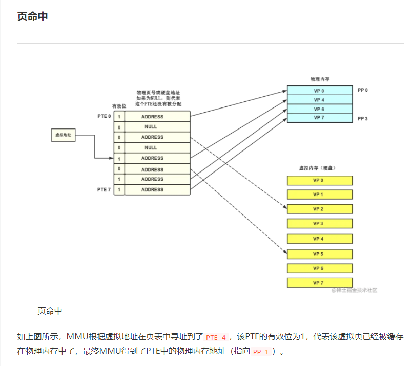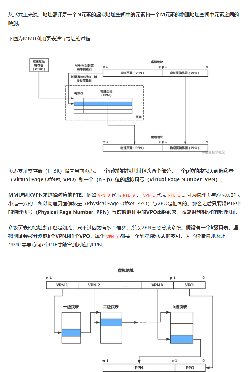 CPU中含有一个被称为内存管理单元(Memory Management Unit, MMU)的硬件,它的功能是将虚拟地址转换为物理地址。MMU需要借助存放在内存中的页表来动态翻译虚拟地址,该页表由操作系统管理。