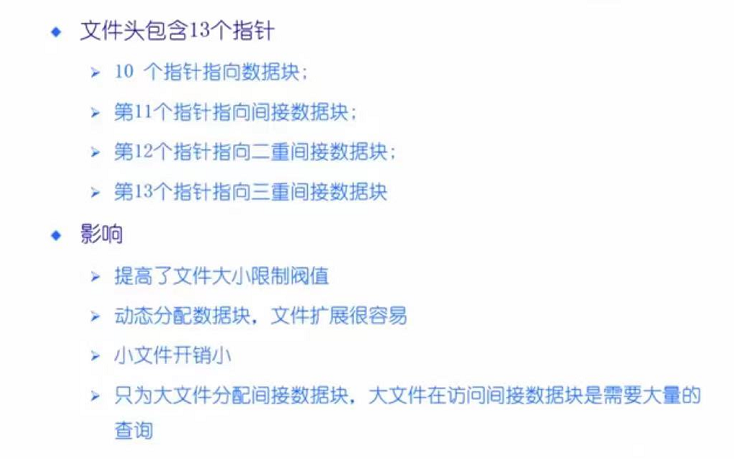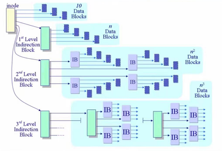 文件比较小的时候支持前十个索引直接使用数据块。当给大文件分配时可以使用多级索引,一般三级索引足够了。